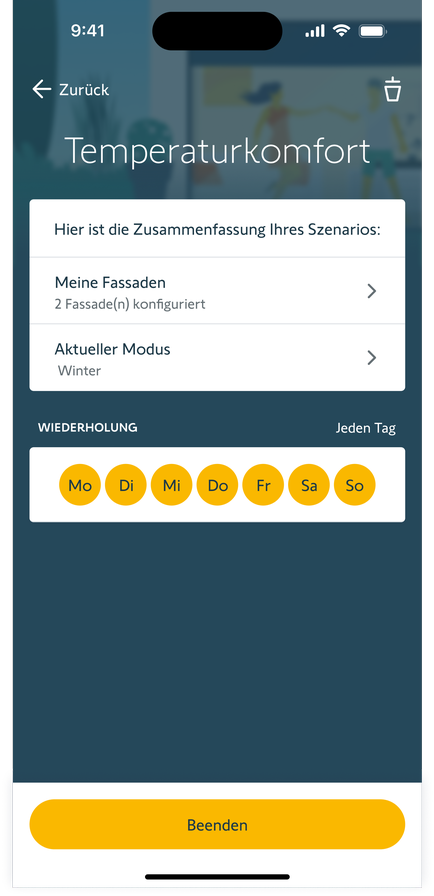 An heissen Tagen sorgen Sie mit Ihrem Smart Home für eine intelligente Klimaregulierung, noch bevor die Hitze Ihre Wohnräume erreicht. Sensoren erkennen eine hohe Sonneneinstrahlung und fahren den Sonnenschutz automatisch in die optimale Position, um Schatten zu spenden. Das hält Ihre Räume angenehm kühl und ist insbesondere dann praktisch, wenn Sie gerade nicht zu Hause sind, um Raffstore, Markise oder Jalousie selbst zu steuern. Kehren Sie abends in ein kühles Zuhause zurück und schonen gleichzeitig Ihr Budget. Denn durch die smarte Vernetzung können Sie bis zu 70 %* beim Einsatz von Klimaanlagen sparen.