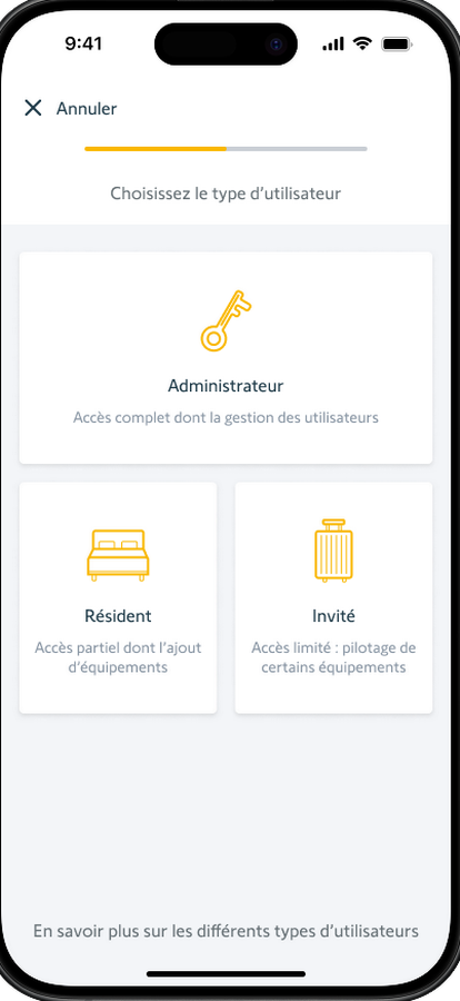 En tant qu’administrateur, vous invitez de nouveaux utilisateurs directement via leur adresse e‑mail dans l’application TaHoma. Cela garantit un haut niveau de sécurité.